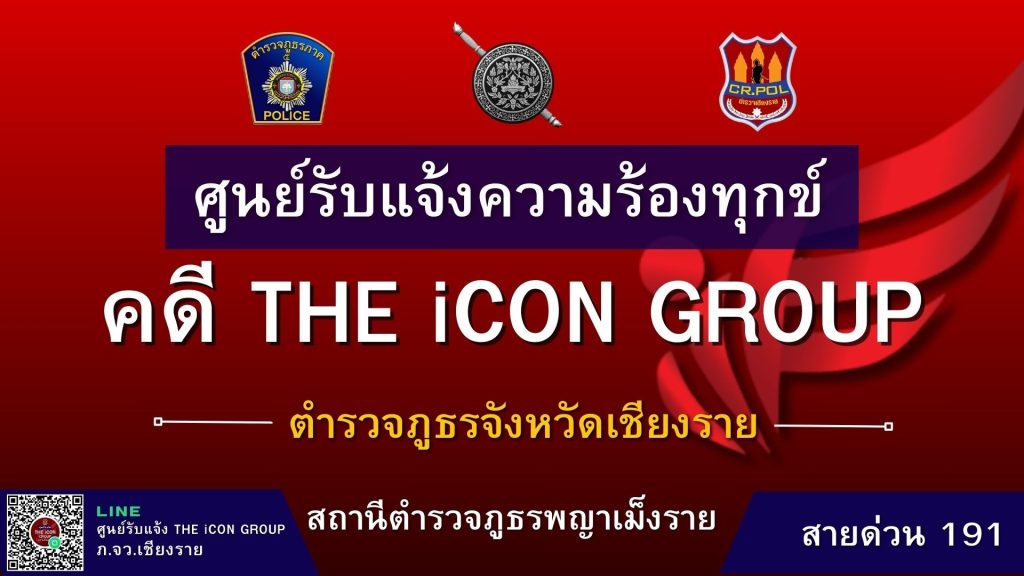 ติดต่อสอบถามและติดตามการดำเนินงาน ของเจ้าหน้าที่ตำรวจได้ที่ Line Open Chat: ศูนย์รับแจ้ง THE iCON GROUP ภ.จว.เชียงราย
